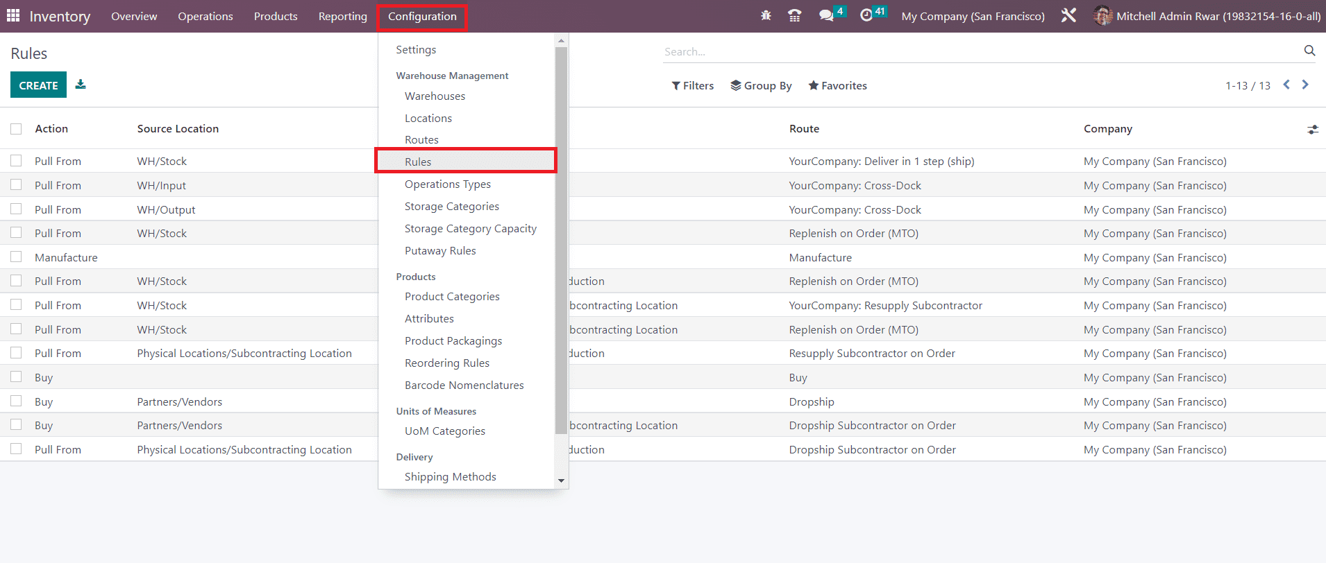 Now, let’s check how to configure routes using these rules in the Odoo Inventory.