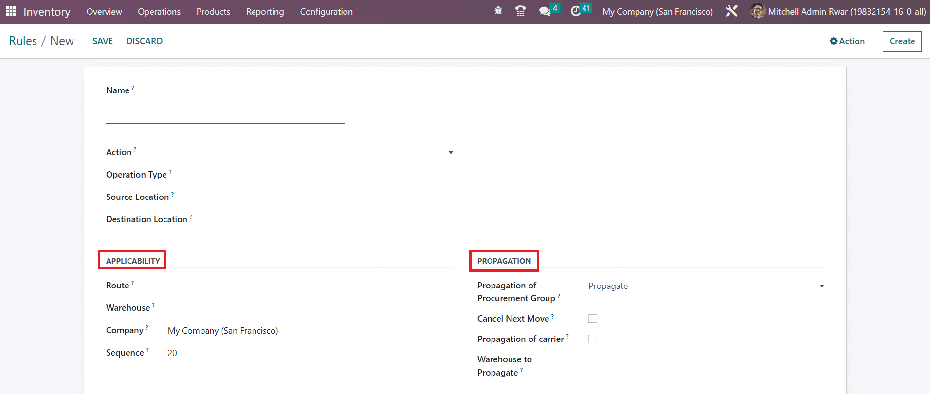 From this preview, you will get the Action, Source Location, Destination Location, Route, and Company details of each Rule. Just like in any other platform, Odoo makes sure of the availability of the default and customizable Filters and GroupBy options to simplify the searching operations. Without any delay, you can click the Create button to know the steps of the configuration of the new rule in Odoo.