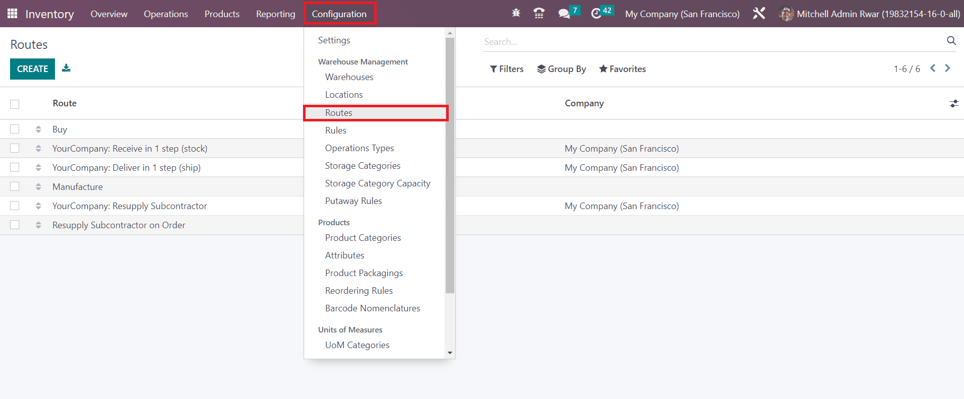 The Warehouse Management tools available in the Configuration menu of the Inventory module will give access to the platform to manage and create various routes of operation. The user can observe the preconfigured list of routes here with the details of the name of the routes and the company.