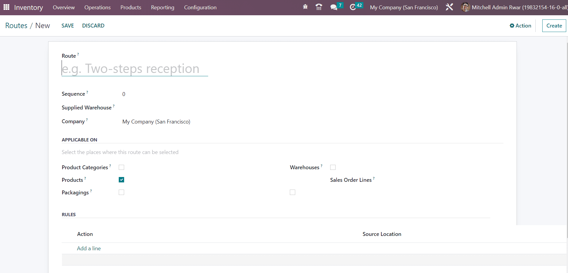 Click the Create button to create a new route for inventory movements.