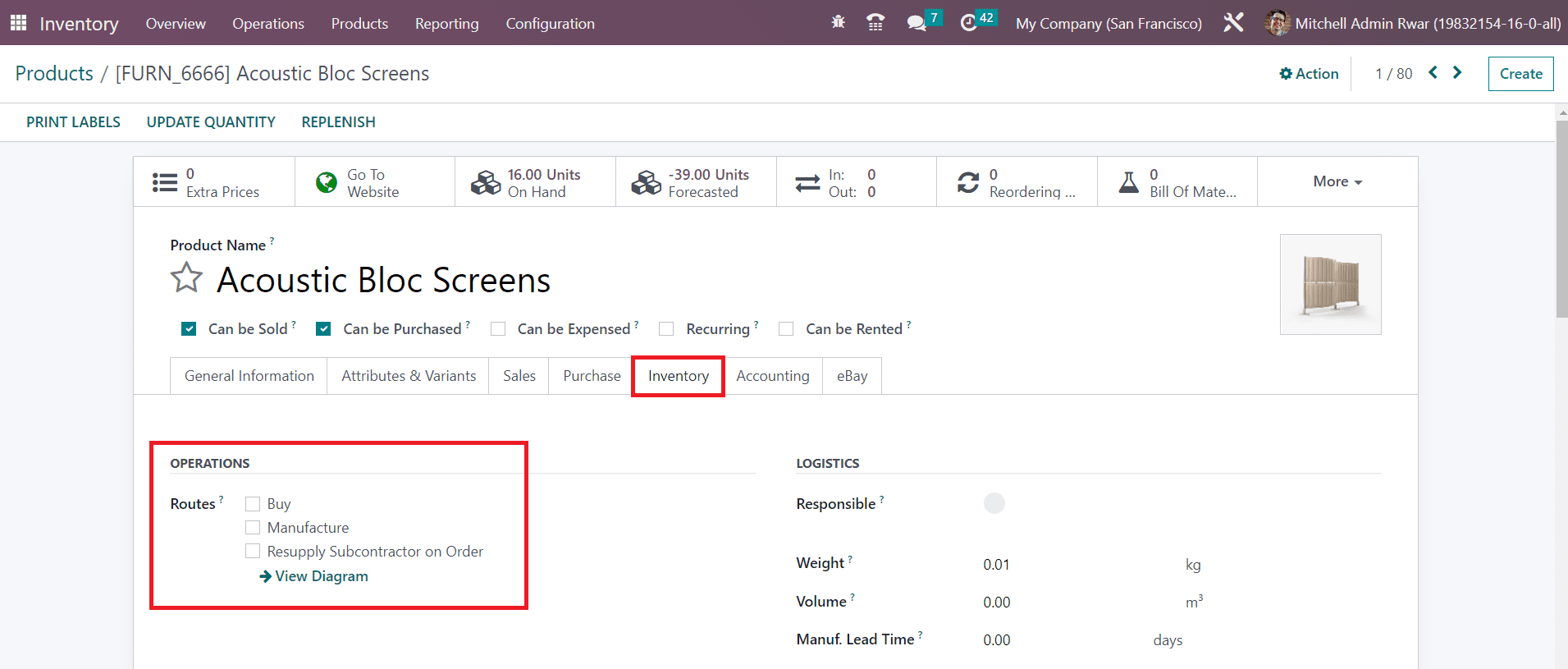 In Odoo, you can define a specific route of operation for each product while configuring them in the database. In the products management window, you can find a dedicated field under the Inventory tab as shown below exclusively to select the suitable route for the inventory movement of a product.