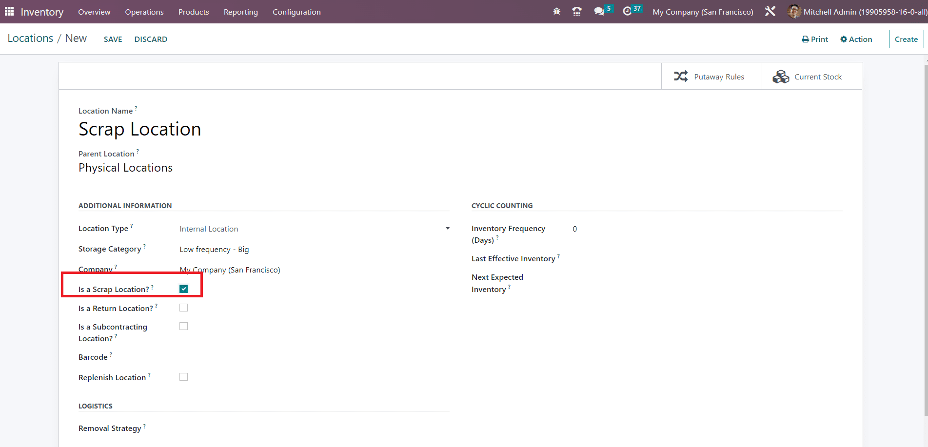 In the new location creation window, you can mention the name of the location in the given field. Here, we mentioned the location name as Scrap Location. You can follow the remaining steps just like we detailed in the Location configuration section earlier. The most important step is that you need to activate the Is a Scarp Location field to consider this location as a scrap location. After specifying necessary details in the Additional Information, Cyclic Counting, and Logistics tab, you can click the Save button. We have completed the creation of a location for scrap in the storage. You can create more scrap locations following this method.