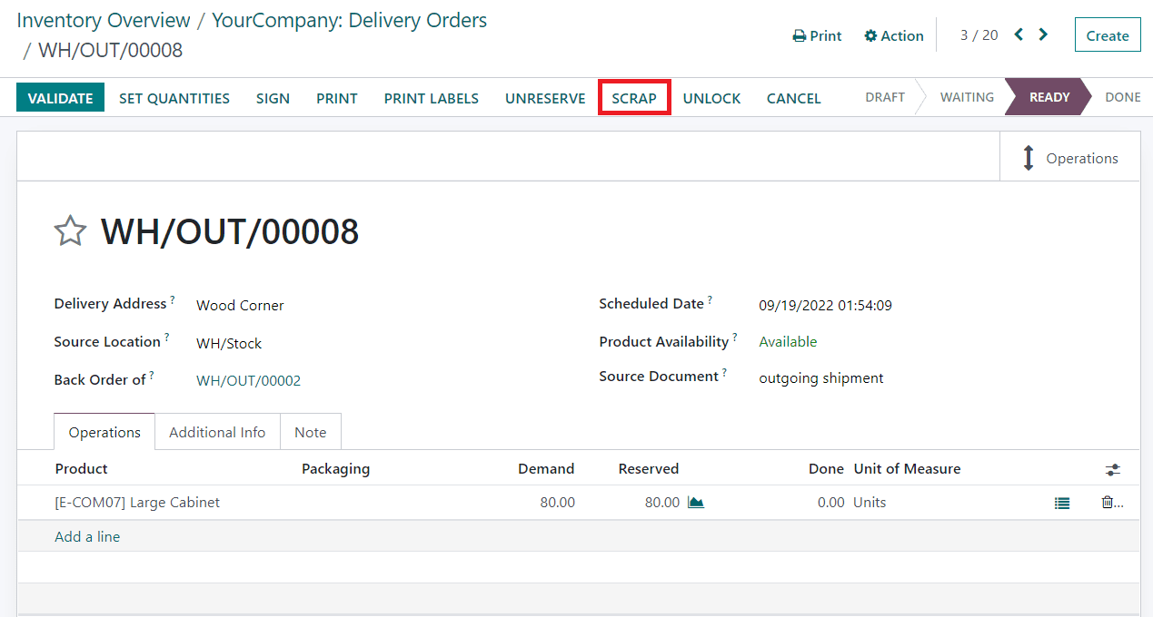 You can find the Scrap button on the delivery orders as shown in the screenshot above. In case, any products in the delivery order are damaged or expired, you can click on this button to add those products to scrap.