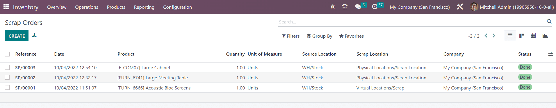Under the Operation menu of the Inventory module, you will get a separate platform to manage all these scrap orders as shown below.