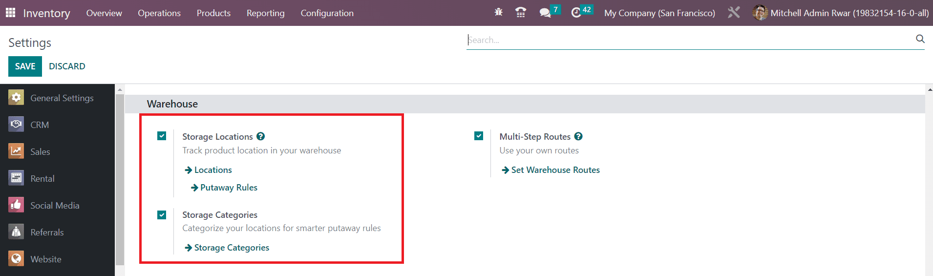 The Storage Categories feature in Odoo will allow you to group many storage locations together under a single category. You can create many such categories in the Odoo Inventory module that will be beneficial to perform smarter put-away operations. Before configuring the storage categories, you must configure the storage locations available in your inventory. Then you can group them together under a specific category. By activating the Storage Location from the Settings module, you can create and manage all storage locations in your company. As soon as you activate this option, you will get an additional field called Storage Categories as shown below to define various categories for the available storage.