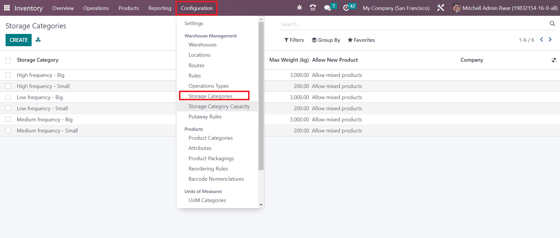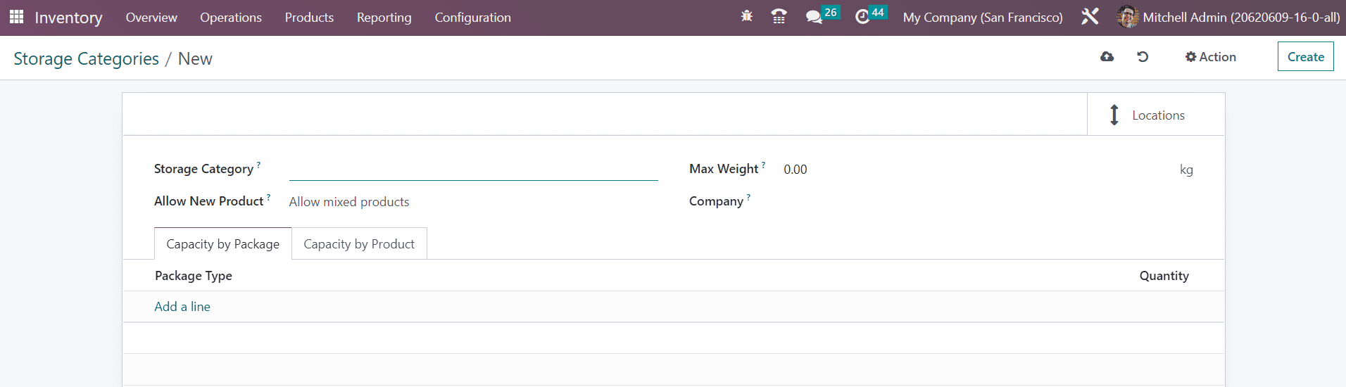 The list view of this window will show the details regarding the available Storage Categories, Max Weight, Allow New Product, and Company. In order to create a new storage category, we can use the Create button.