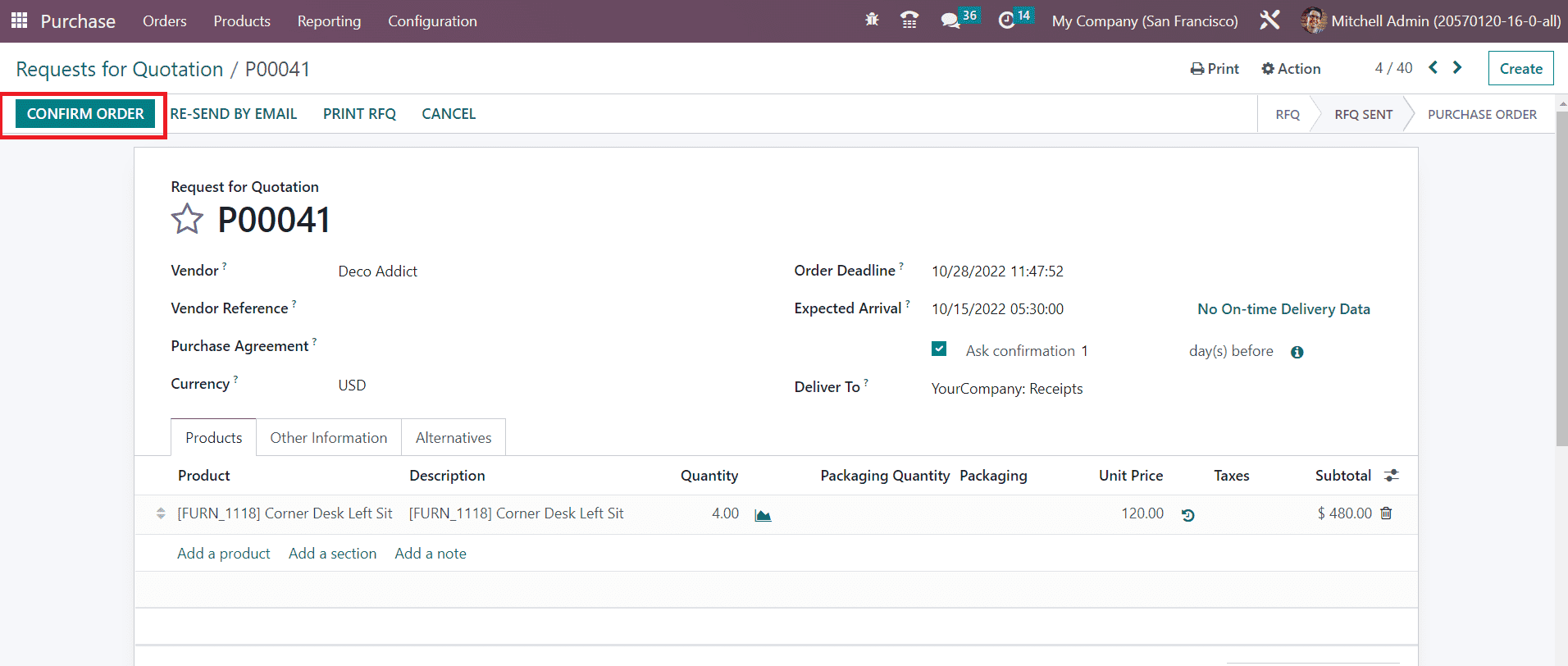 The status of the RFQ can be observed as Purchase Order once you click on the Confirm button.