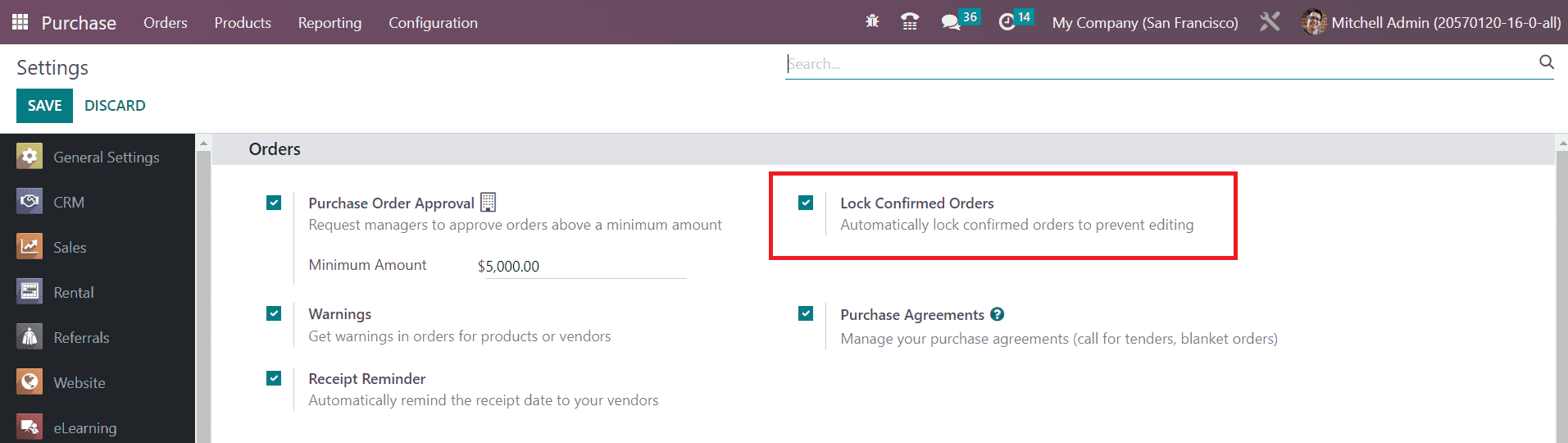 In Odoo, it is possible to automatically lock purchase orders to prevent editing. This can be done by activating the Lock Confirmed Orders from the Settings menu of the module.