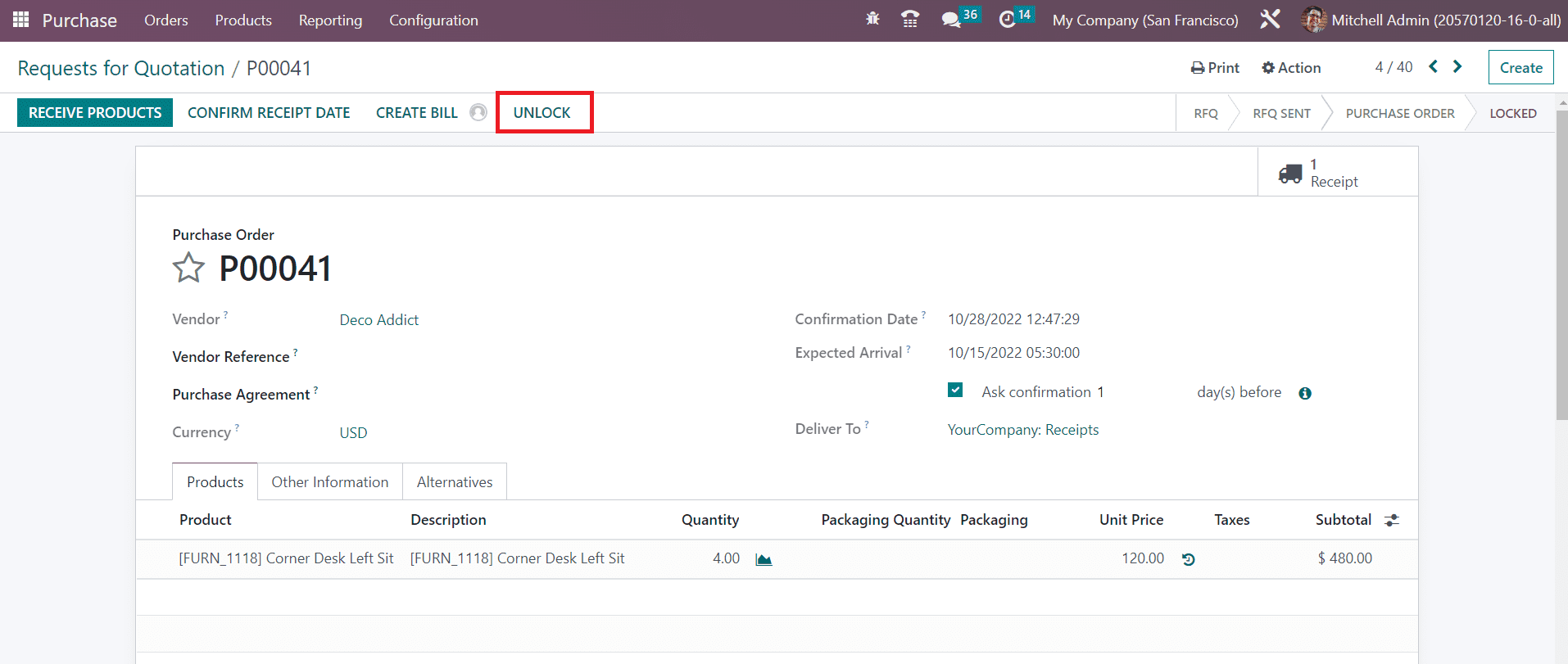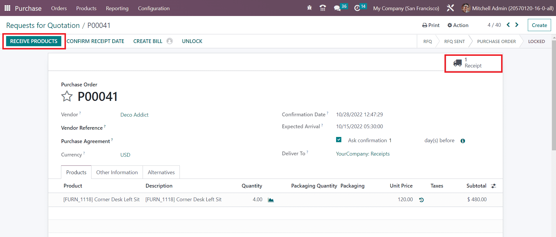 In the Purchase Order window, you will get options such as Receive Products to manage received products, Confirm Receipt Date to confirm the date of the receipt, Create Bill to generate vendor bill, and Cancel to cancel the purchase order.