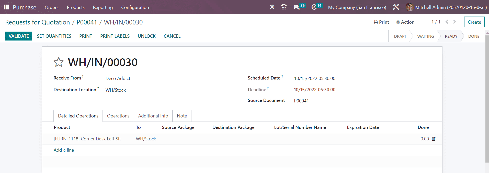 You can validate the delivery receipt using the Validate button after checking the details. The Receive From field will show the name of the supplier of the products. The Destination Location will show the delivery location mentioned by you while creating the purchase order. In the corresponding fields, you will get the Scheduled Date, Deadline, and Source Document of the delivery receipt.