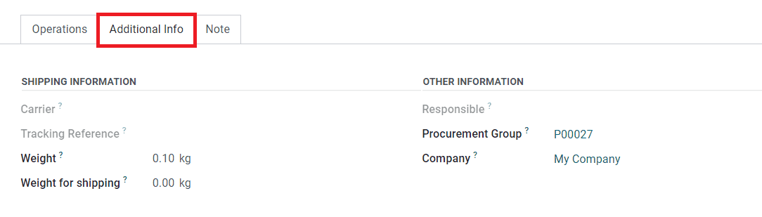 In the Shipping Information section, you will get the details of the Carrier, Tracking Reference, Weight, and Weight for Shipping. The Other Information section will show the name of the Responsible employee, Procurement Group, and Company in the respective fields. The Note tab will show the related notes of the incoming shipment.