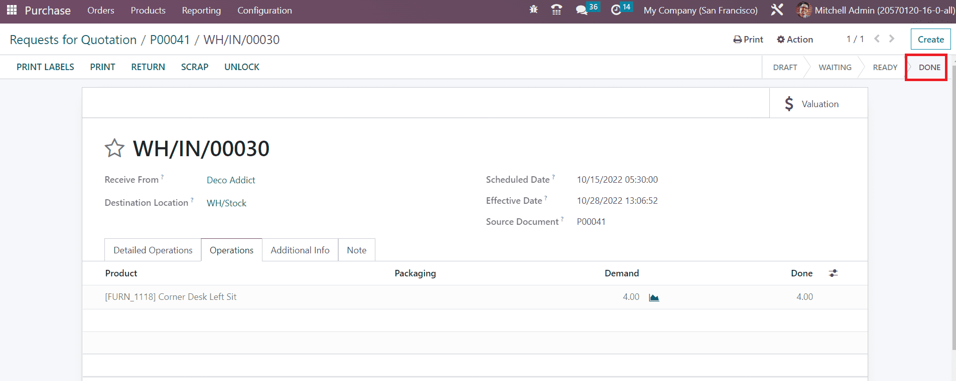 The status of the receipt has changed to Done which indicates that the transfer has been processed.