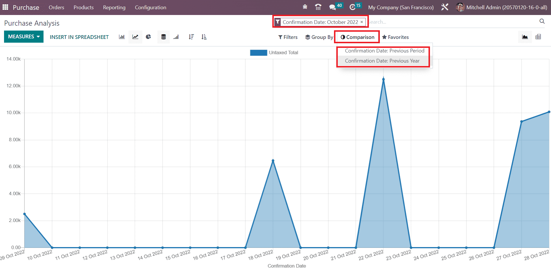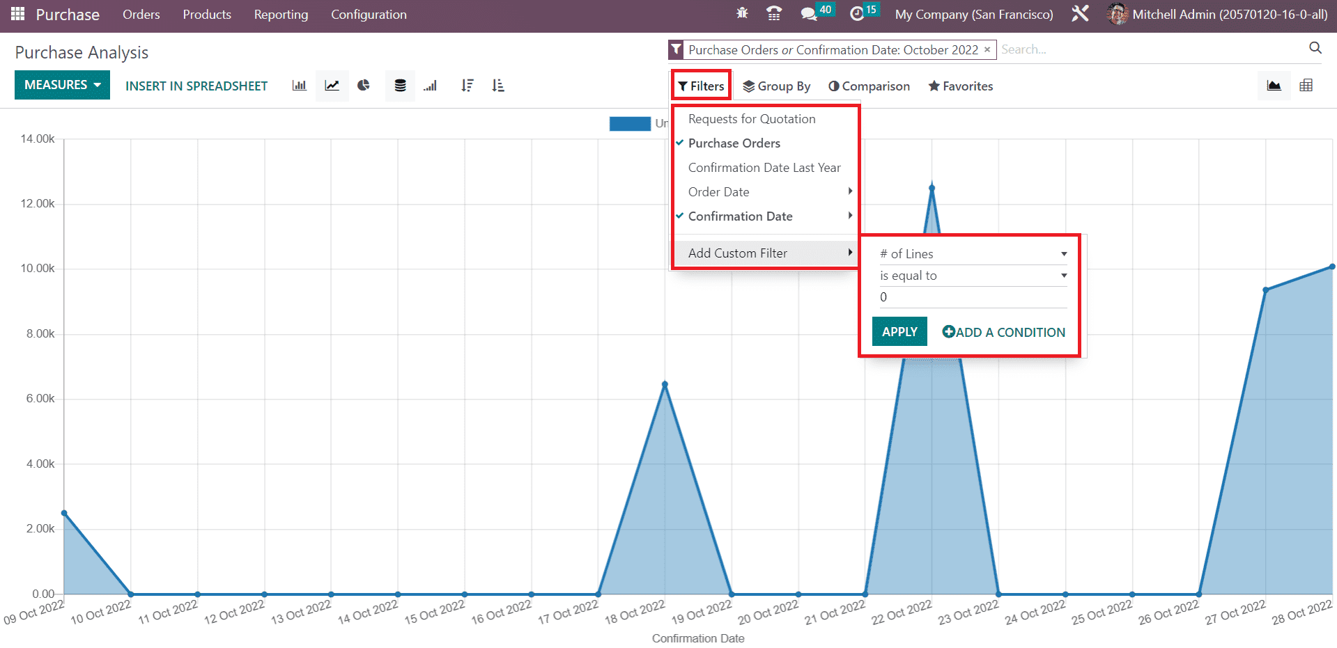 You can filter the report based on the Request for Quotations, Purchase Orders, Confirmation Date Last Year, Order Date, and Confirmation Date. Using the Add Custom Filter option, you can create new custom filters for your reports.
