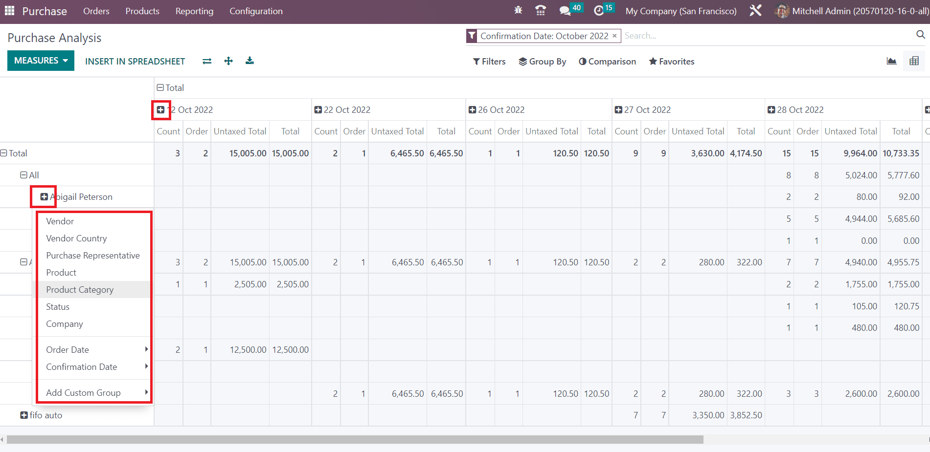 Using the small + icon will help you to expand the table with additional data. You can convert the report into a spreadsheet using the Insert Spreadsheet button. Based on your requirements, you can customize the purchase reports and analyze them without any confusion.