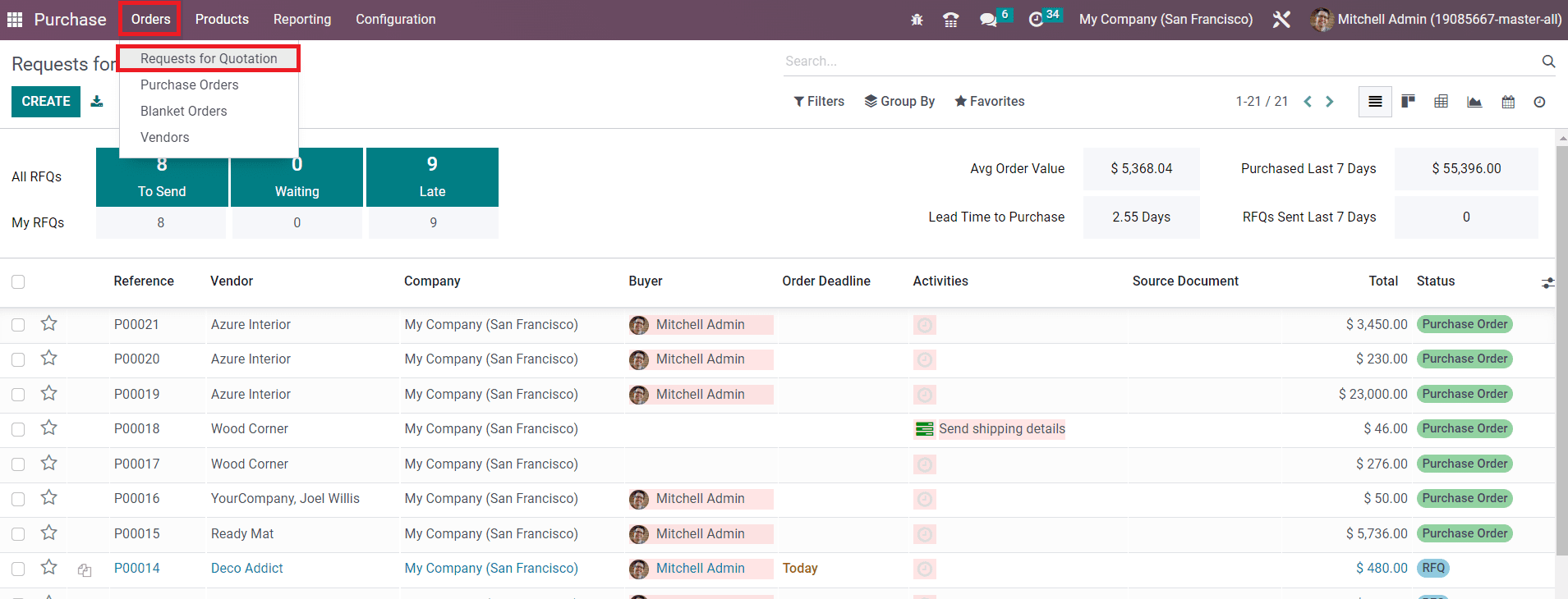 As highlighted in the image above, you will be able to get the number of All RFQs as well as MY RFQs (the RFQs created by you or assigned to you) in the RFQ window. These fields will show the total number of RFQs to send to respective vendors, RFQs waiting for the confirmation from vendors, and late RFQs separately. Additionally, you will get the details of the Average Order Value, Purchased Last 7 Days (total amount of products purchased within last 7 days), Lead Time to Purchase (average lead time in days from the confirmation of purchases orders to purchase), and RFQs Sent Last 7 Days (total number of RFQs sent within last 7days).