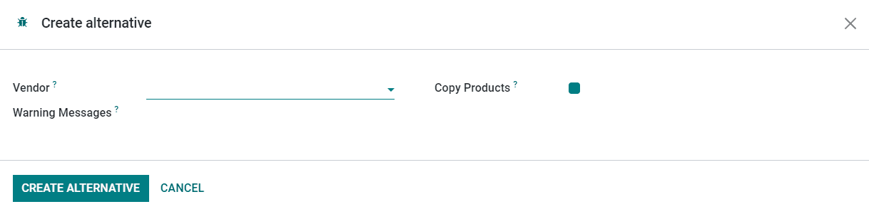 By comparing product lines of different suppliers, you can easily decide to order some products from one vendor and others from another vendor. In order to create alternatives, you can click on the Create Alternative button which will open a wizard as depicted below.