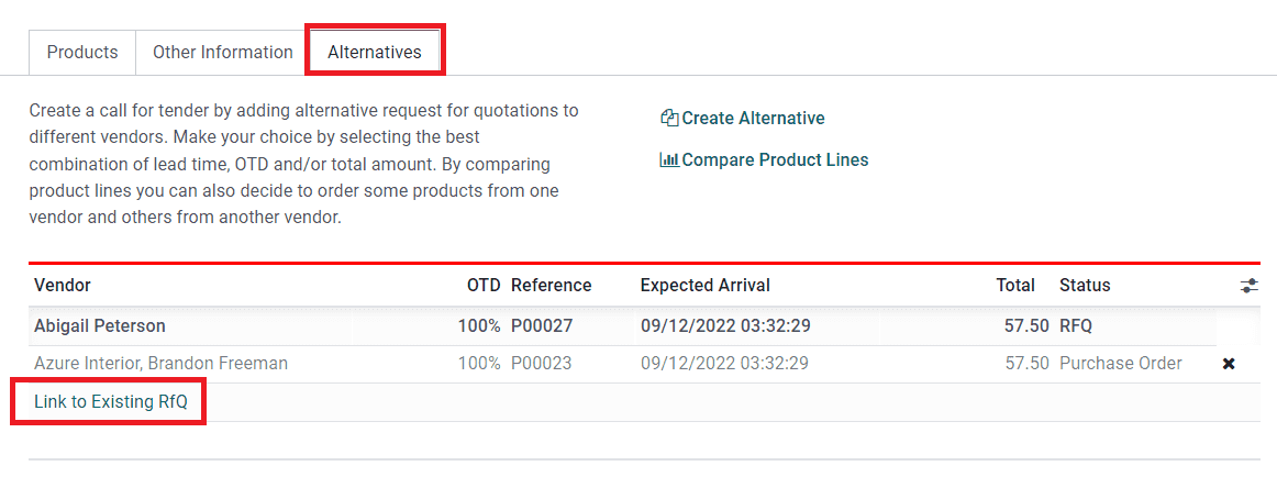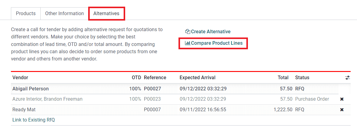 Odoo lets you compare the product line with the help of the Compare Product Lines button. Clicking on this button will direct you to a comparison window where you will get the list view of the alternative purchase orders with the details of the Product, Vendor, OTD Reference, Description, Expected Arrival, Quantity, Unit of Measures, Unit Price, Total, and Currency.