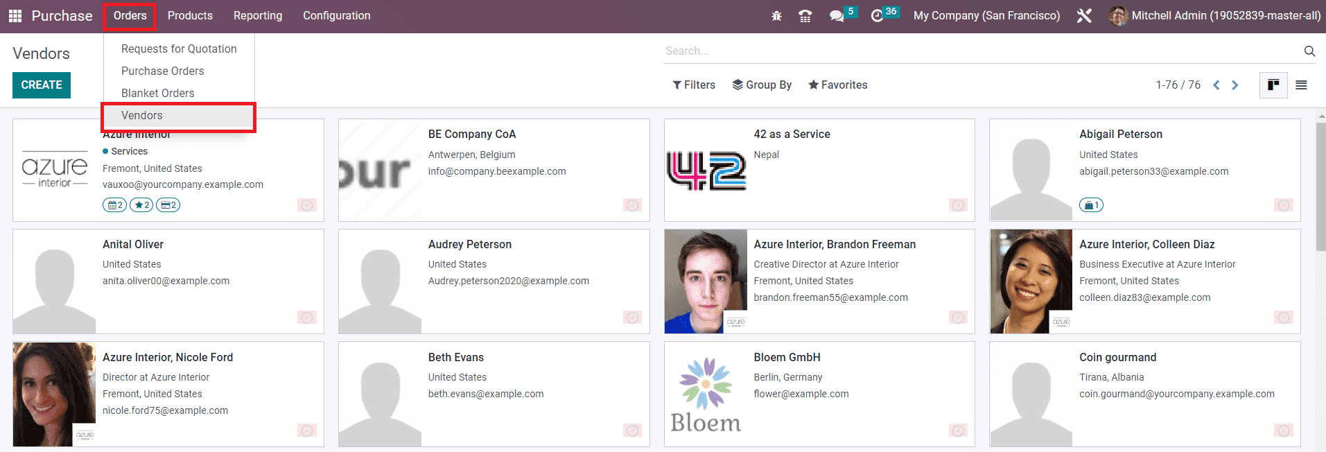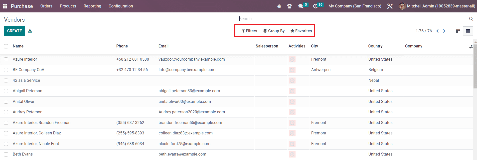 The Filters, Group By, and Favorites options can be used to sort the available list of vendors as per your requirements with default and customizable features. In order to configure a new vendor to your database, you can use the Create button.