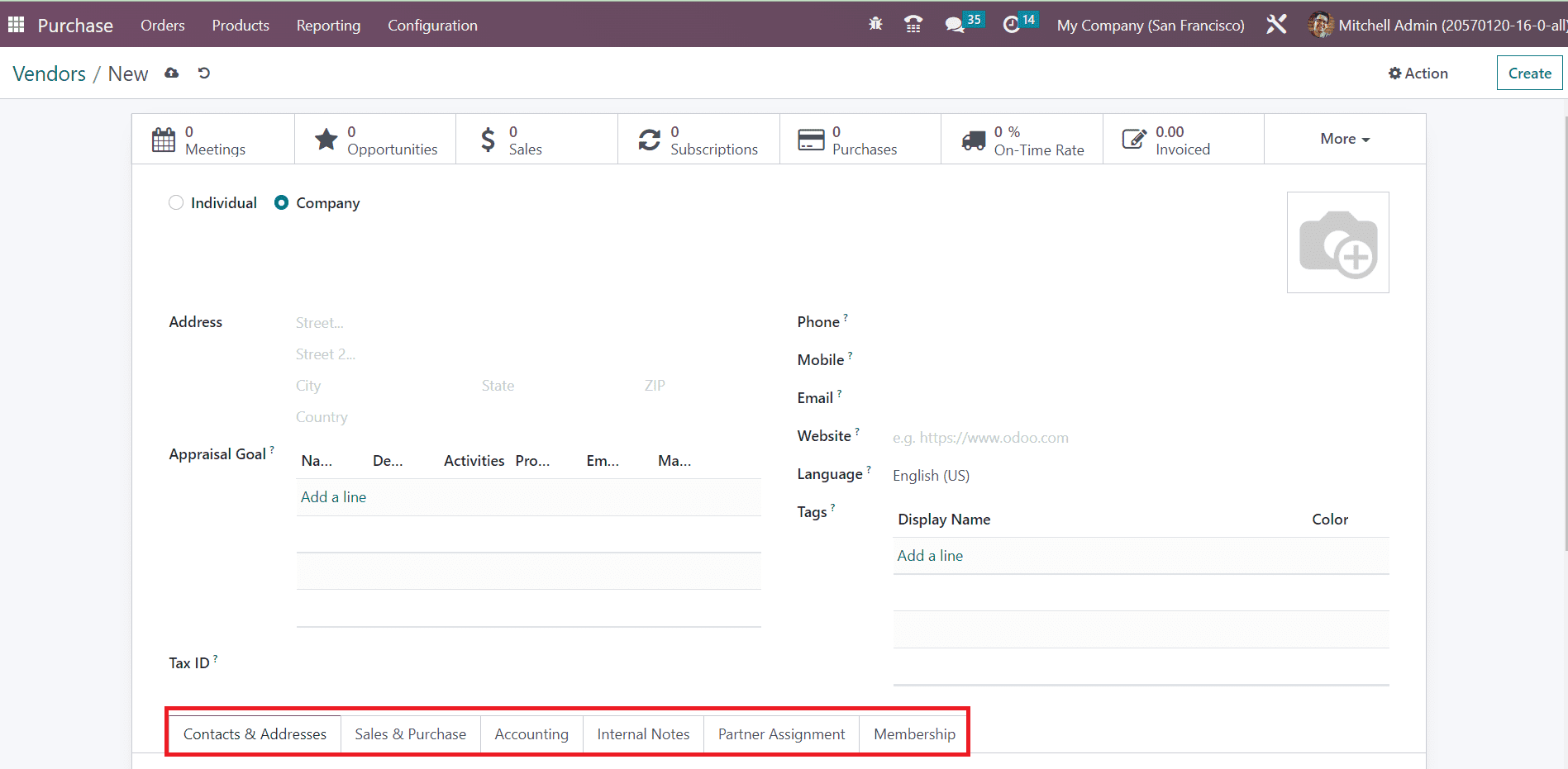 The method of configuring a new vendor in the Purchase module is the same as that of the customer configuration in the Sales module. You can complete the Contacts & Addresses, Sales & Purchases, Accounting, Internal Notes, Partner Assignment, and Membership tabs by following the steps we discussed in the Sales chapter.