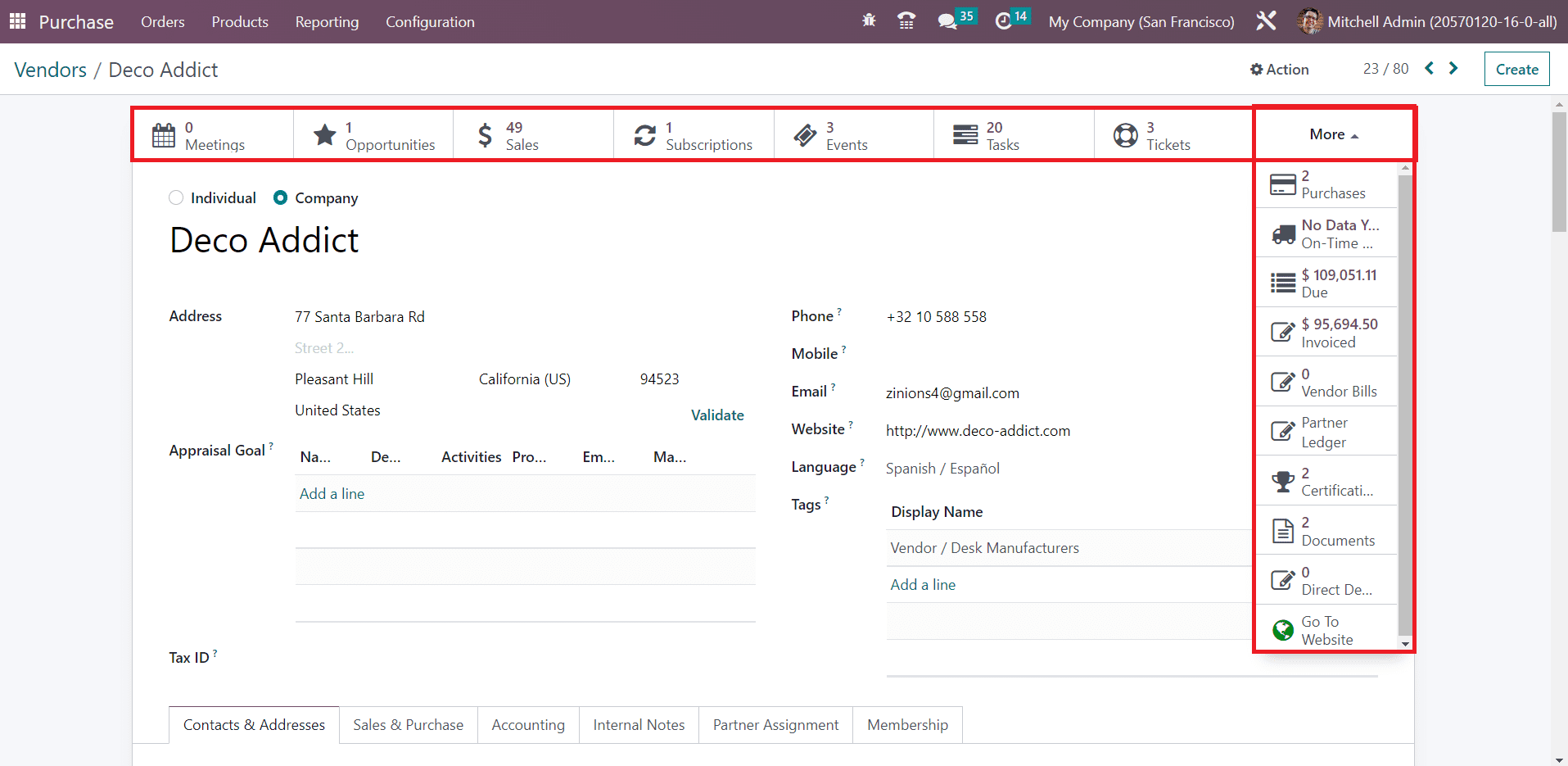 The Meetings button will record all scheduled activities with this vendor. The total number of opportunities, sales, subscriptions, events, tasks, and tickets created from this vendor can be observed using the corresponding smart buttons. Clicking on the More option will show additional smart buttons such as Purchases, On-time Delivery, Due, Invoiced amount, Vendor Bills, Ledger, Certificates, Documents, and Direct Debit Mandates.