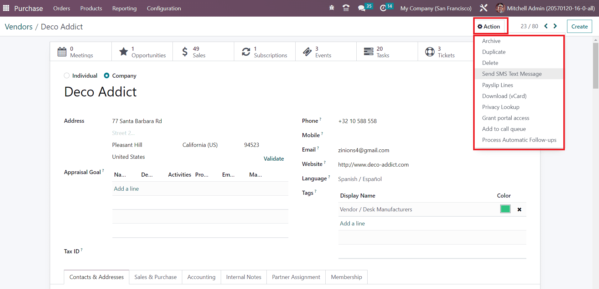 You will get a set of separate operation tools under the Action button. With the help of this button, you will get access to Archive, Duplicate, Delete, Send SMS Text Messages, Payslip lines, Download (vCard), Privacy Lookup, Grant Portal Access, and Process Follow-ups.