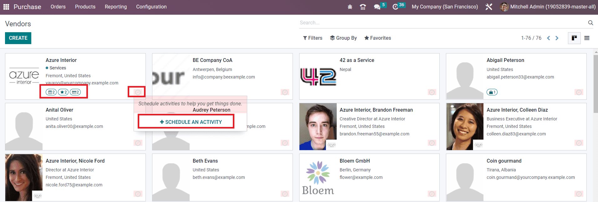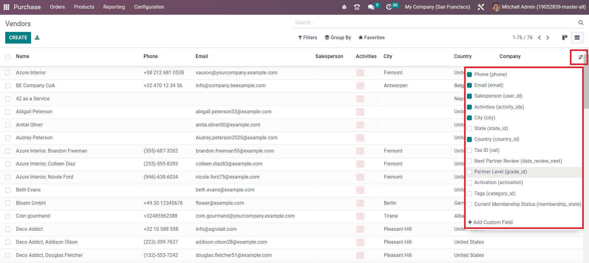 The list view of this platform will show the Name, Phone, Email, Salesperson, Activities, City, Country, and Company of the vendor.