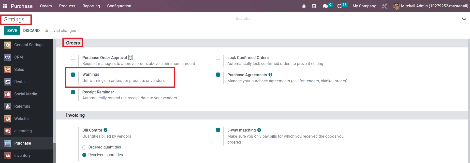 After activating this feature, make sure to click the Save button to save the new changes. Now, you can set warning messages for vendors and products in your Purchase module.