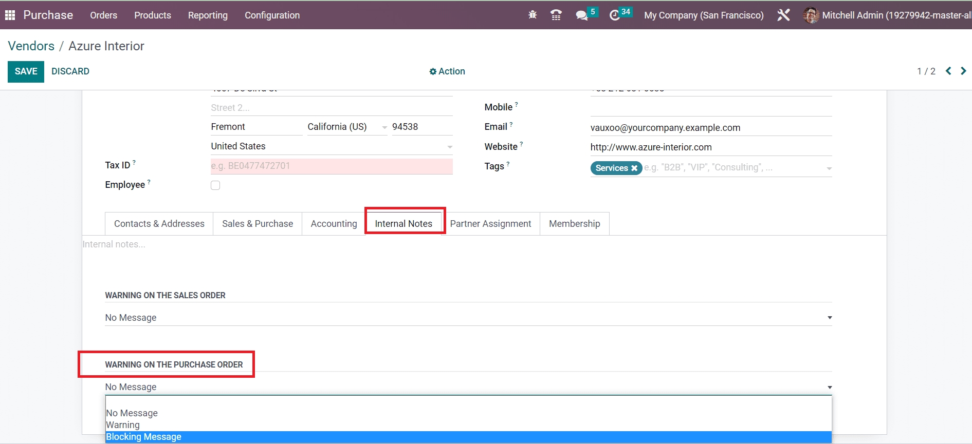 Under the Internal Notes tab, you will get the Warning on the Purchase Order option where you can select a suitable operation from the given options for the purchase order with this vendor. If you don’t want to generate any kind of warning message, you can select the No Message option. In case you face any difficulties from this vendor, you can raise warnings using the Warning option and block messages using the Blocking Message option respectively.