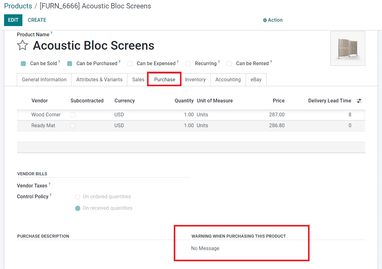 When you confirm a purchase order with a vendor or product with a warning, Odoo will automatically raise a warning message so that you will be notified regarding the issue with the selected vendor or product.