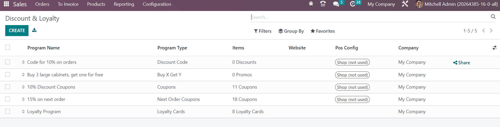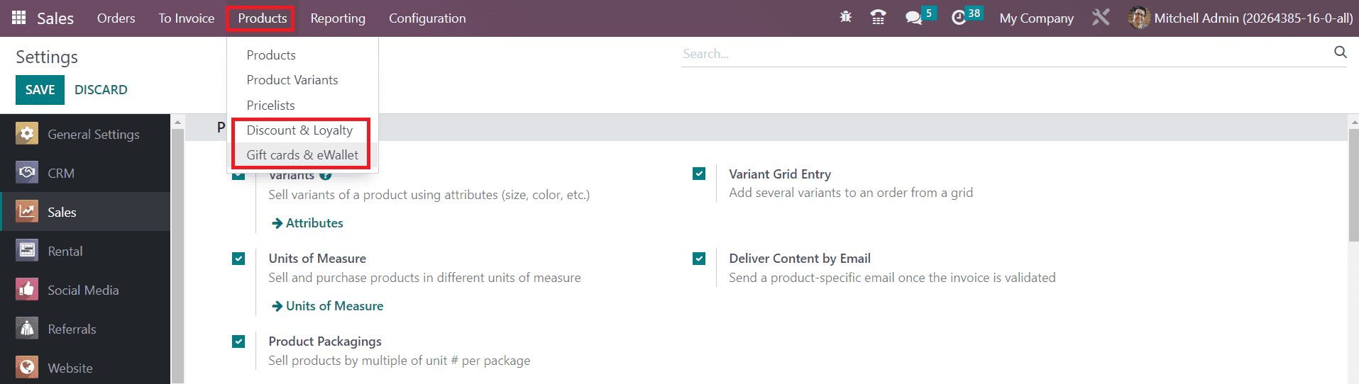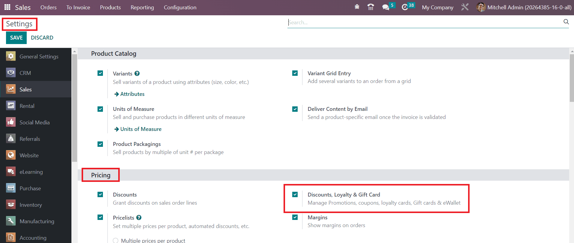 Instead of the Promotion and Coupon Programs in Odoo 15, you can find a single platform to configure discount, gift cards, eWallet and loyalty under the Product menu in Odoo 16. You can activate this feature from the Settings menu of the Sales module.