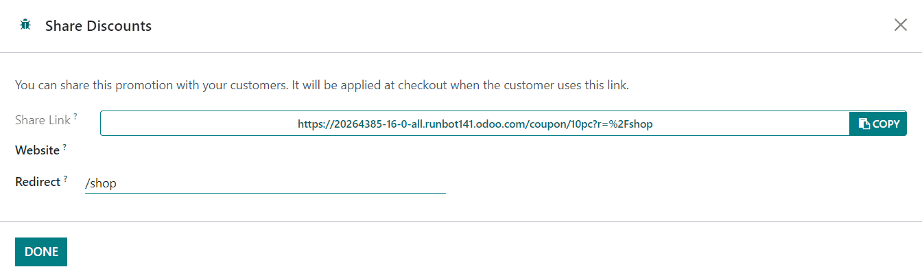 The preview of the list includes the Program Name,, Program Type, Items, Website, POS Configuration and Company details. Additionally, you will get a Share button that helps you to share the coupon on a particular website. A wizard will appear as soon as you click the Share button as depicted below.