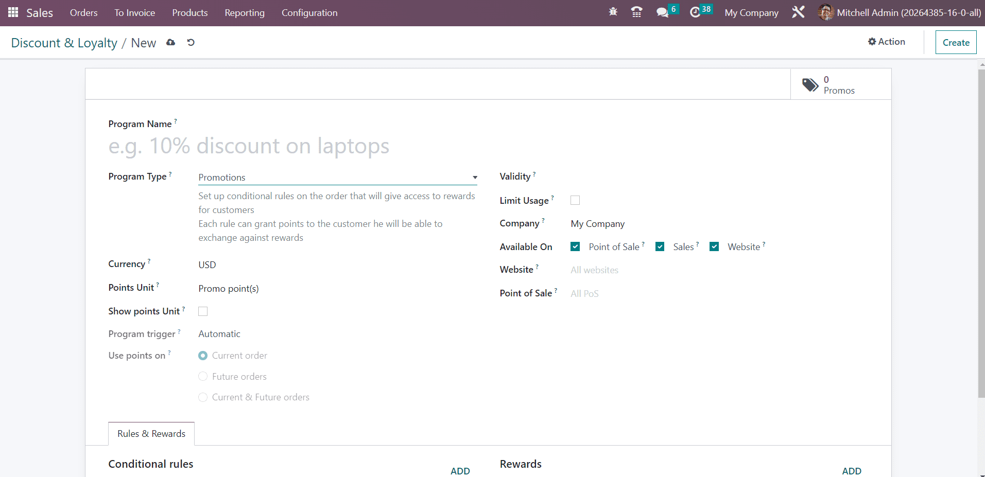In Odoo 16, you can create Coupons, Loyalty Cards, Promotions, Discount Code, Buy X Get Y, and Next Order Coupons from a single place. The method of creation of all these program types is almost similar. So, let's select a program type and detail its creation. Here, we selected Promotions as the Program Type. In the corresponding fields, you can specify the Company, Points Unit, Currency, and Website. In the Validity field, you can set an ending date for the promotion program.