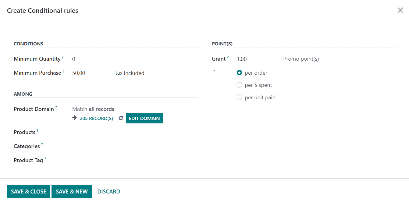 In the Conditions tab, you can mention the Minimum Quantity and Minimum Purchase amount to qualify for this promotion program. If you want to provide this promotion for particular Products, Categories, and Product Tag, you can specify them in the corresponding fields. Under the Points tab, you can mention the promo points in the Grant field. It can be granted based on the order, money spent, or unit paid. After configuring the new rule, you can use the Save button.