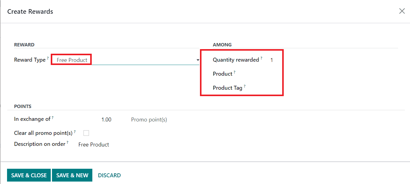 It is possible to give free products as a reward in Odoo. For this, you can select the Reward Type as Free Product. As soon as you select this option, you will get some additional fields to specify the details of the free product.