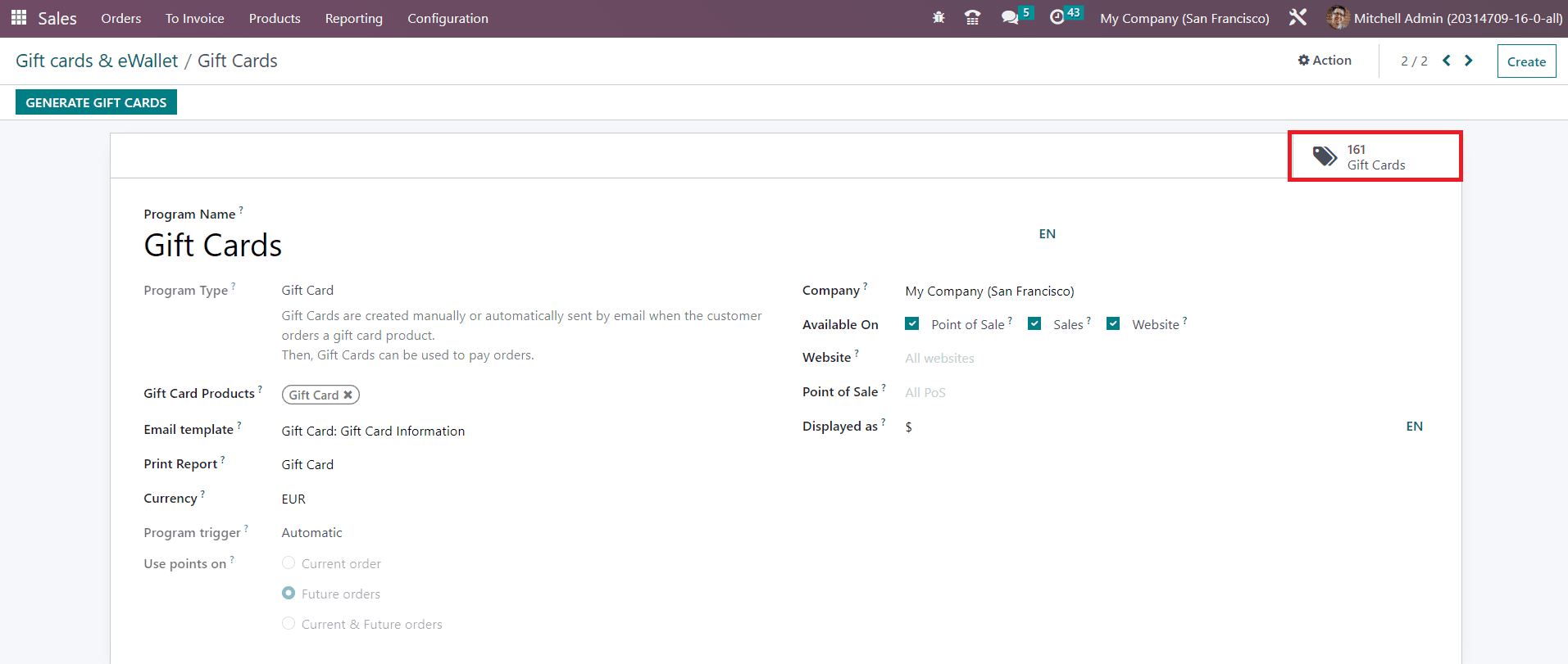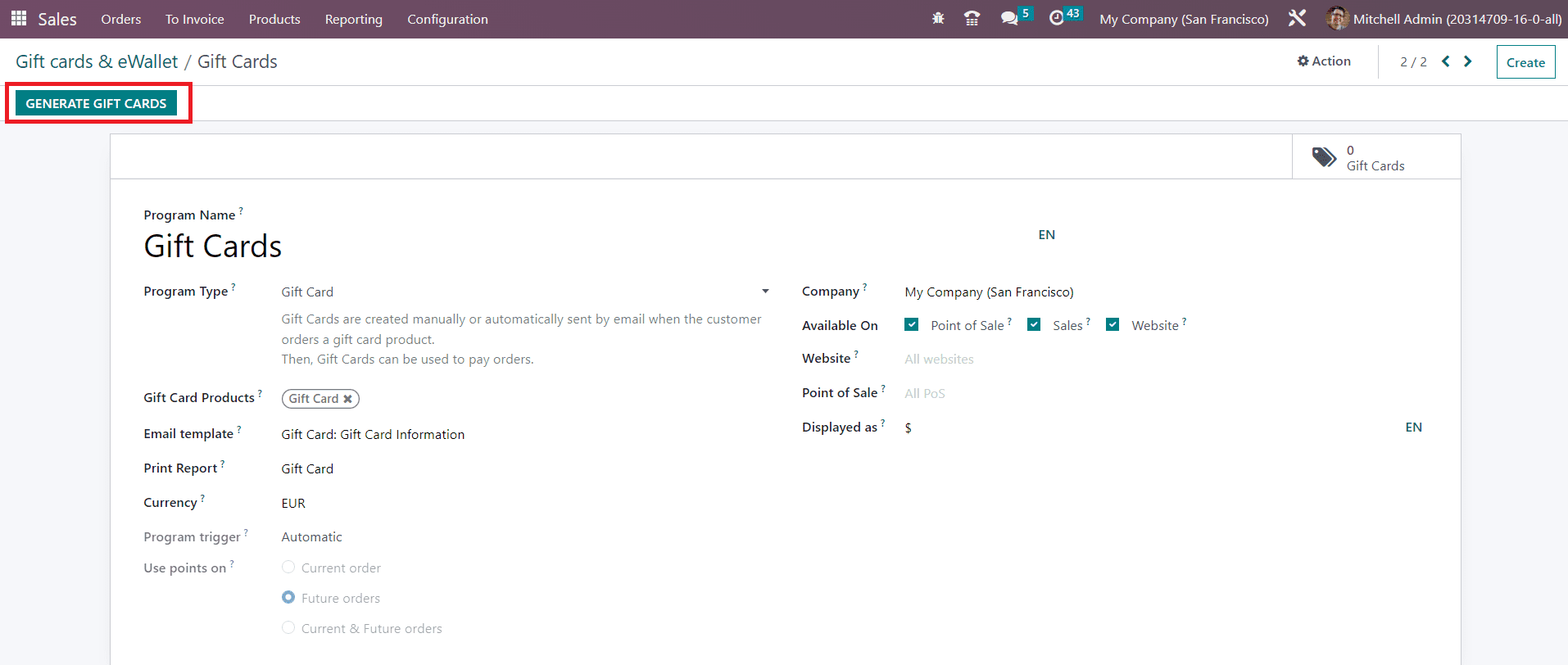 Here, you can specify the Program Name in the given field. In the Program Type field, you can define which type of program you want to create. It can be either a Gift Card or an eWallet. First, let’s take a look at the generation of gift cards. Gift Cards are created manually or automatically and sent by email when the customer orders a gift card product. The Gift Cards can be used to pay for orders. After selecting the Program Type as Gift Card, you can trigger product ids in the Gift Card Products field. In the Email Template field, you can add an email template for this gift card which will be used to send to the customer when they qualify for this reward. The option mentioned in the Print Report will be used to print the generated gift cards from PoS. The Currency used for the transactions of this gift card can be specified in the corresponding field. After mentioning the Company, you can make this gift card available on Point of Sale, Sales, and Website by activating the respective fields. You will get additional fields to mention the respective Point of Sale and Website on this platform. You can specify the point portal name in the Displayed as field.