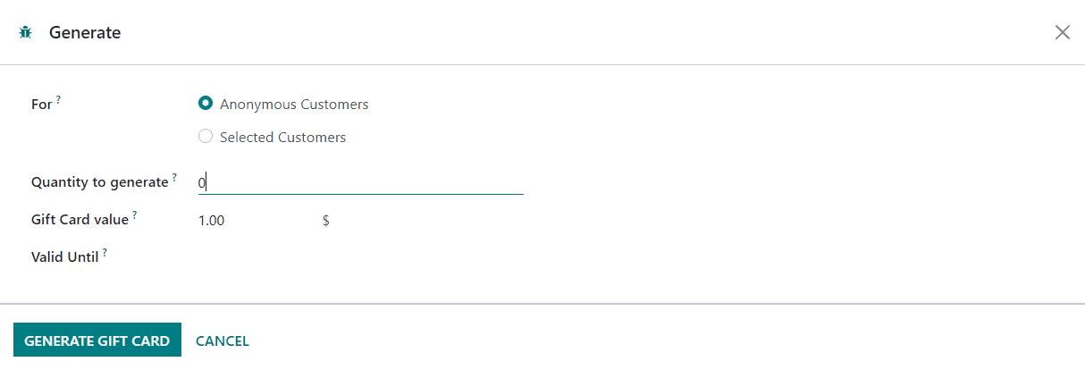It is possible to generate gift cards for Anonymous Customers as well as Selected Customers based on the option you select in the For field. In case you want to generate gift cards for Selected Customers, Odoo will provide additional fields to mention the Customers and Customer Tags. The total number of gift cards that you want to generate can be specified in the Quantity to generate field. Along with this, please mention the points granted to the customers in the Gift Card Value field. The Valid Until field will define the validity of these newly generated gift cards. Finally, clicking on the Generate Gift Card button will generate the required amount of gift cards. You can observe them using the smart button available on the screen as highlighted in the image below.