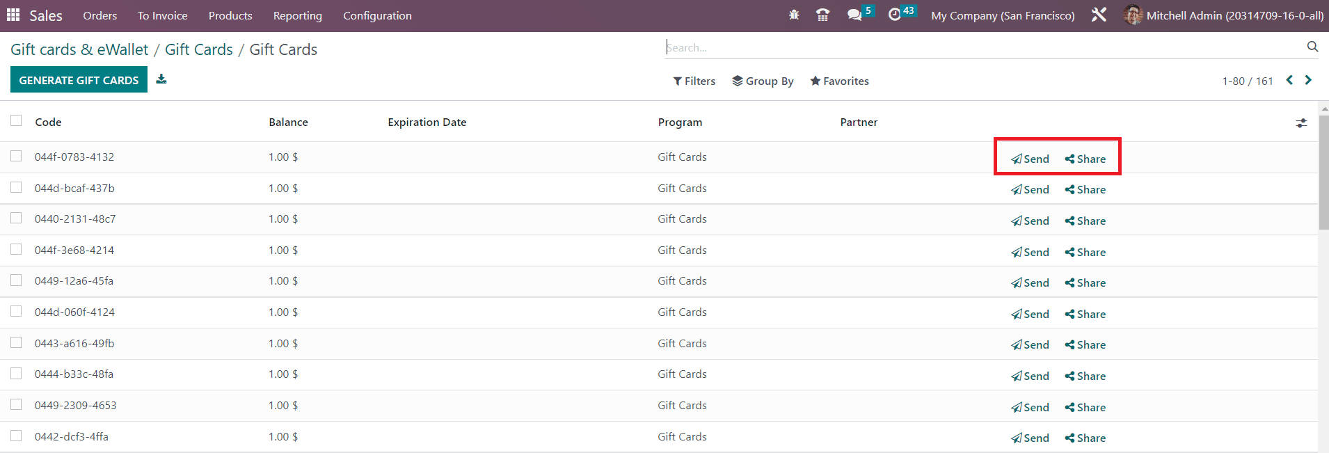 As soon as you click this button, the list of all generated gift cards will appear on the screen. It shows the details of the gift card Code, Balance, Expiration Date, Program, and Partner.
