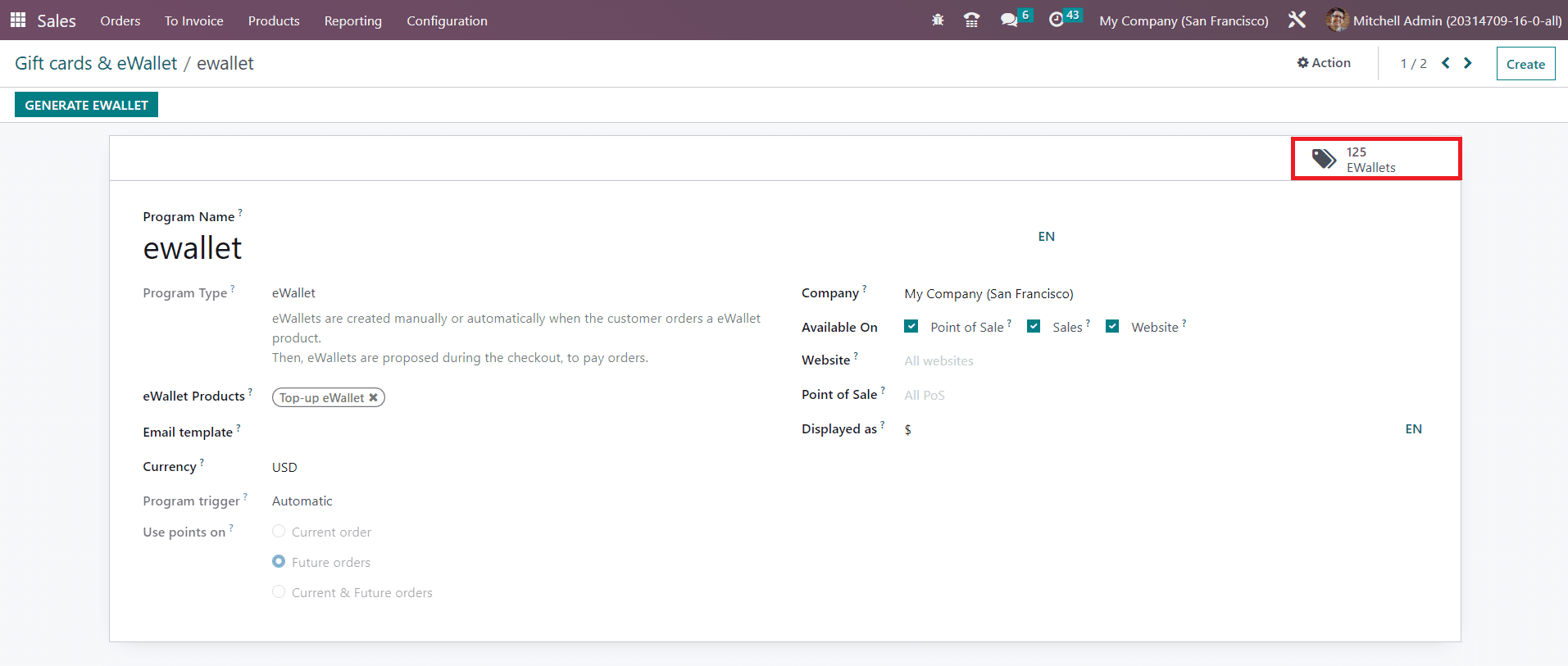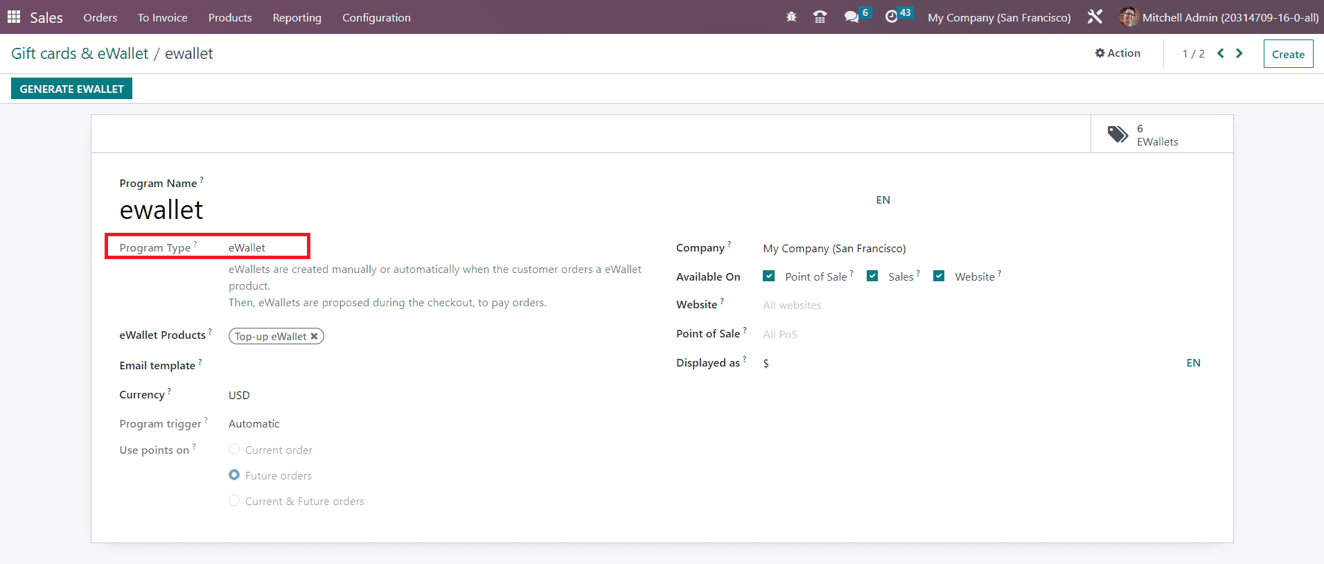 Generation of eWallets can be also easily done by following the similar method we used in the generation of gift cards. In the Program Type field, you can select the eWallet option. The eWallets are created manually or automatically when the customer orders an eWallet product. eWallets are proposed during the checkout, to pay orders.