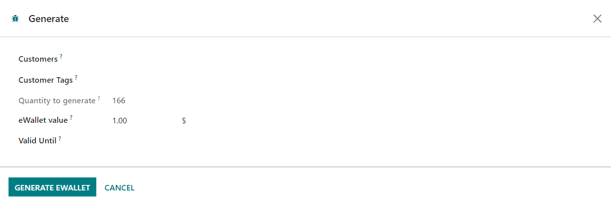 A new wizard will appear where you can mention the Customers, Customer Tags, Quantity to generate, eWallet Value, and Validity in the respective fields. Use the Generate Ewallet button to generate the required quantity of eWallets.