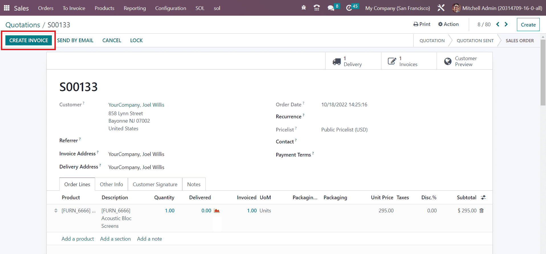Odoo enabled a separate menu in the Sales module for keeping track of the invoices under the To Invoice menu.