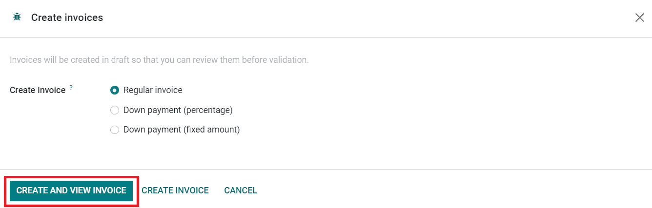 You can select a Regular Invoice, Down Payment (percentage), or Down Payment (fixed amount) based on your company’s invoicing policies. Click on the Create and View Invoice button. Odoo will lead you to a new window that will show the draft form of the invoice.