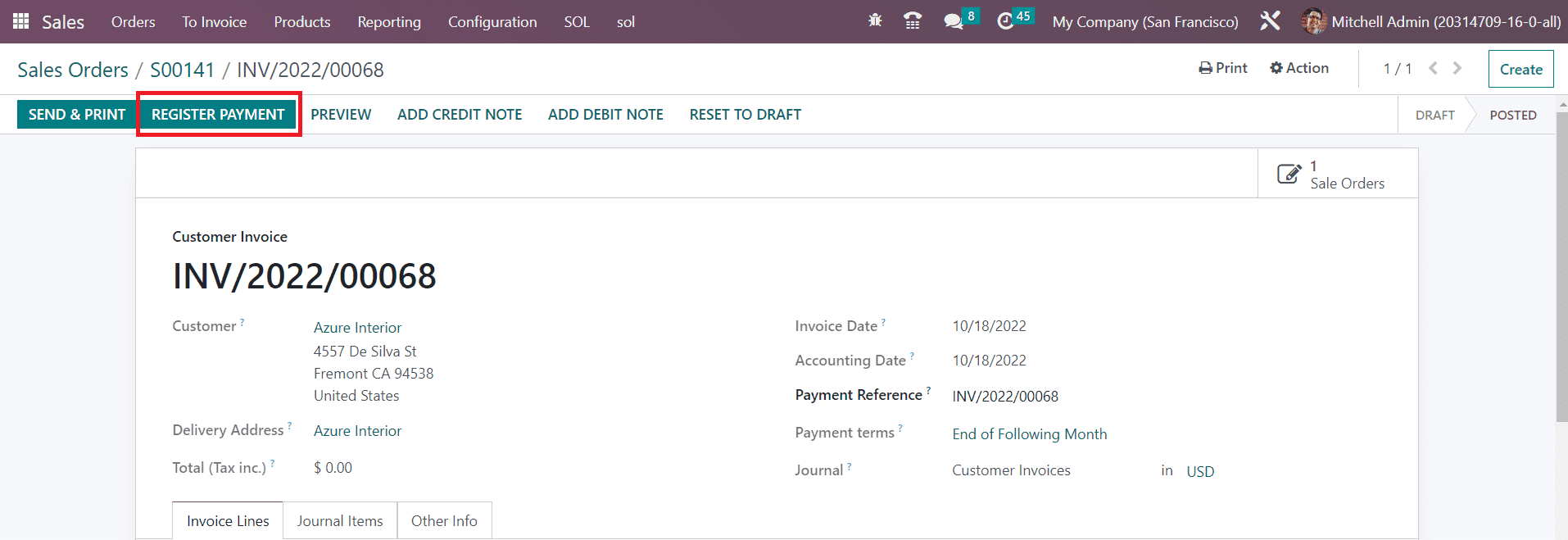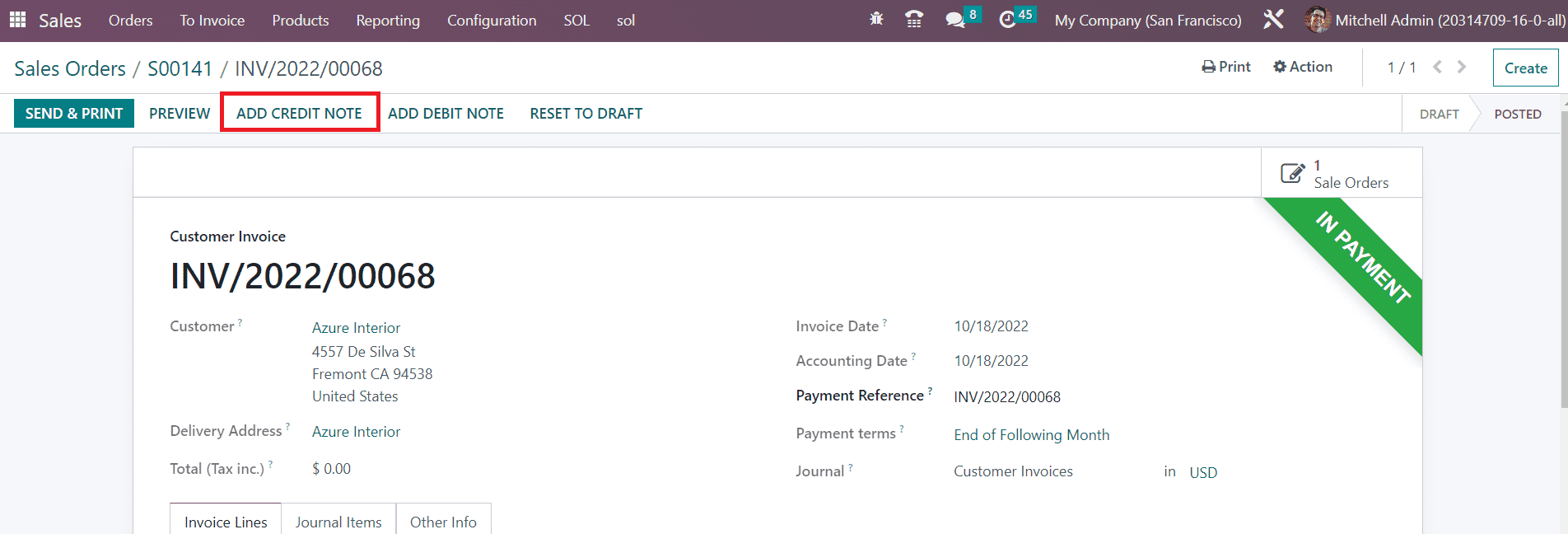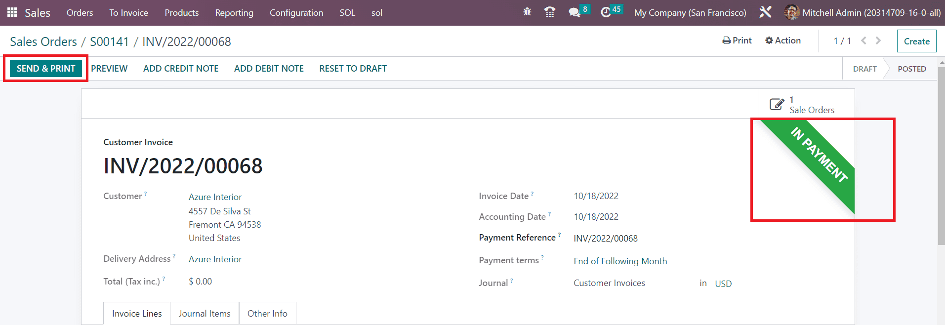 The Send & Print button will help you to send the invoice to the respective customer and take print of it. If you reset the invoice to draft, you can use the Reset to Draft button.