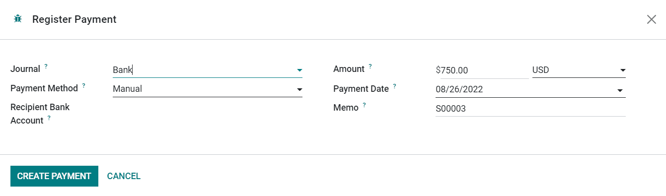 A new wizard will appear where you can define the Journal, Payment Bank, Recipient Bank Account, Amount, Payment Date, and Memo. Click on the Create Payment button.