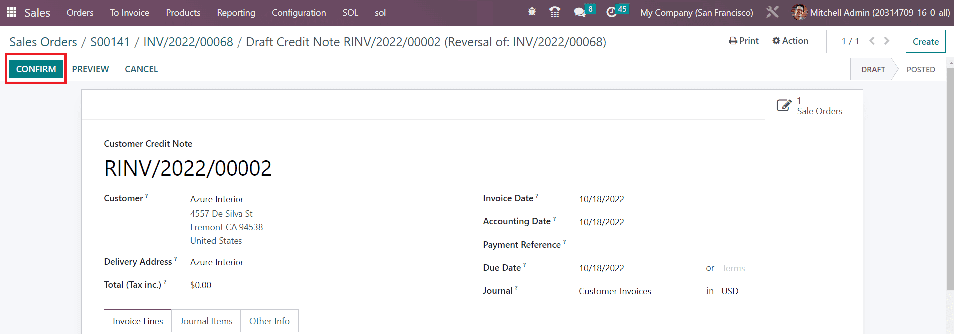 Clicking on the Reverse button will generate a draft form of the Customer Credit Note as shown in the image below.