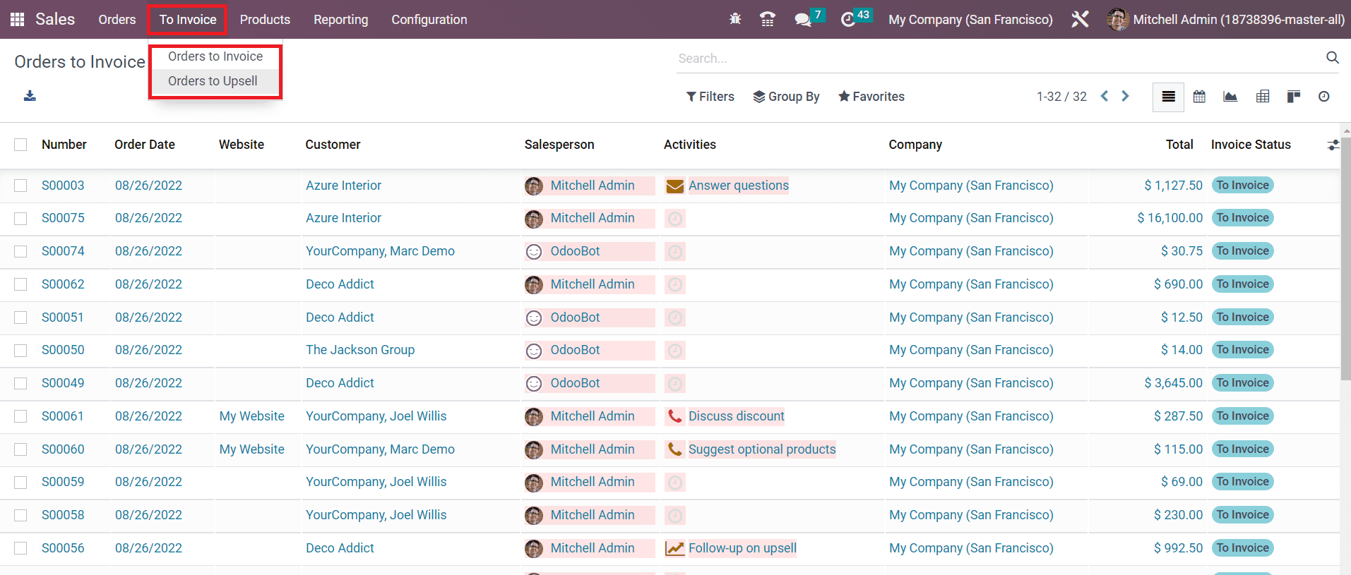 Here, you can find two sub-menus such as Orders to Invoice and Orders to Upsell. The preview of each platform will show the sales Number, Order Date, Website, Customer, Salesperson, Activities, Company, Total, Invoice, and Status. A sales order will be moved to the Orders to Upsell menu when the delivered quantity is greater than the invoiced quantity. For example, a customer ordered for 8 units of a product with the invoicing policy on ordered quantity and 10 units got delivered. In such cases, it is necessary to invoice the extra quantity delivered to the customer. For the extra delivered quantities, Odoo will create an Order to Upsell in the Sales module.