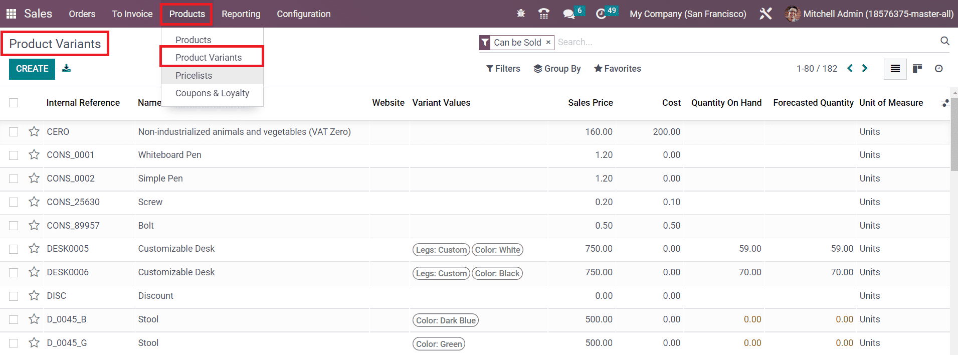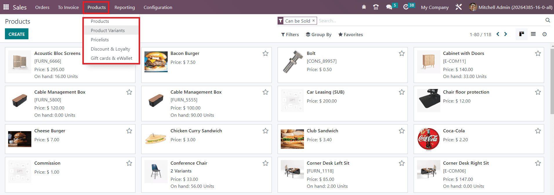 As you can see in the screenshot below, the Products menu will be shown in the main menubar of the Odoo Sales module under which you will get sub-menus such as Products, Products Variants, Pricelists, Discount & Loyalty, and Gift Cards & eWallet.