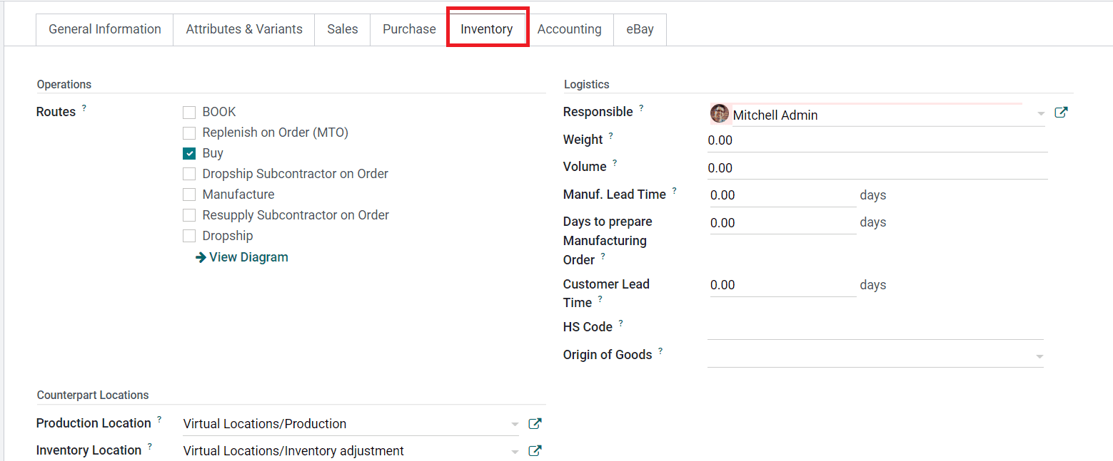 You can define the Manufacturing Lead Time in the given field which is the average lead time in days to manufacture this product, in the case of multi-level BOM, the manufacturing lead time of the components will be added. In case the product is subcontracted, this can be used to determine the date on which components should be sent to the subcontractor. You will also get a field to specify the number of Days to Prepare Manufacturing Orders . In the Customer Lead Time, you can mention the delivery lead time in days. It’s the number of days promised to the customer, between the confirmation of the sales and the delivery. Mention the HS Code in the corresponding field which is a standardized code for international shipping and goods declaration. At the moment, it is only used by the FedEx shipping provider. The Origin of Goods field will determine where goods originate, i.e. not where they have been shipped from, but where they have been produced or manufactured.
