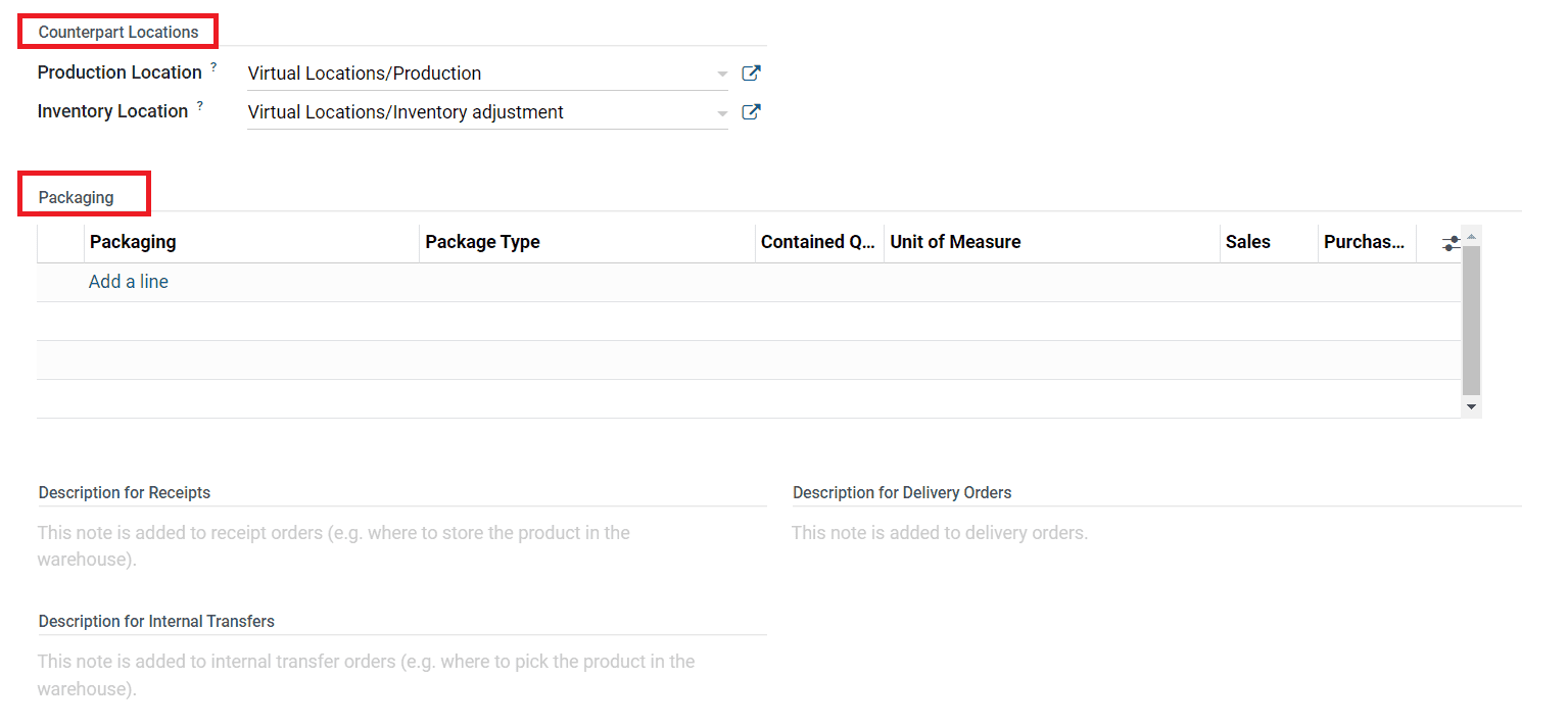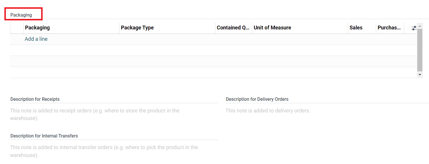 Using the Add a Line button, you are allowed to add Packaging along with the Package Type, Contained Quantity (Quantity of products contained in the package), Unit of Measure, Sales Order, and Purchase Order. Additionally, you can add notes in the Description for Receipts, Description for Delivery Orders, and Description for Internal Transfers in the respective fields.