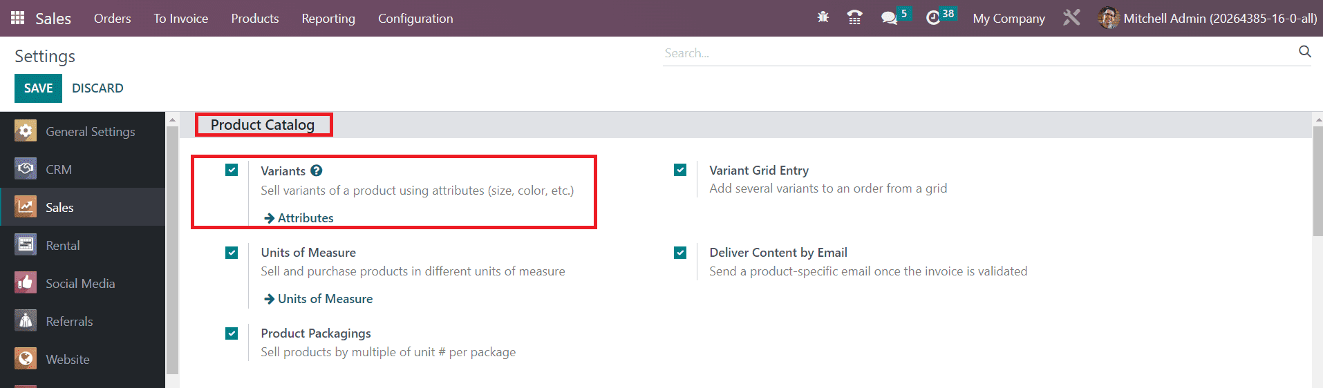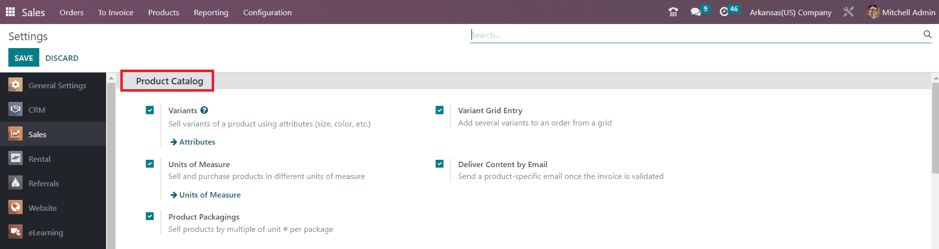 You can offer more varieties of a product to your customers by configuring its variants in the Odoo Sales module. From the Settings menu, you can activate the Variants feature. The screenshot given below shows the Settings menu of the Sales module. Here, you will get the Variants option to activate under the Product Catalog tab. Activating this feature will allow you to sell variants of a product using attributes.