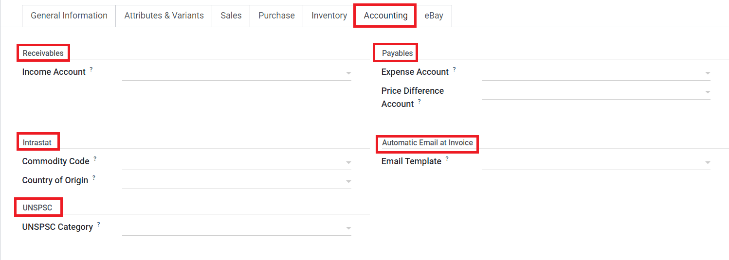 In the Receivables field, you can mention the Income Account and in the Payables field, you can mention the Expense Account . The Price Difference Account is used in automated inventory valuation to record the price difference between a purchase order and its related vendor bill when validating this vendor bill. Under the Intrastat field, you can define the Commodity Code and Country of Origin. By defining an Email Template in the Automatic Email at Invoice field, Odoo will automatically send a product-specific email once the invoice is validated. The UNSPSC code related to the product can be defined in the UNSPSC Category field.